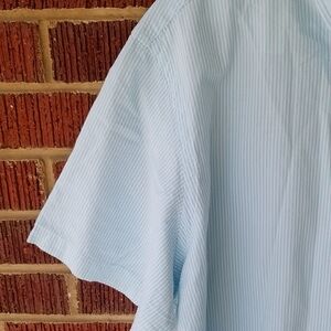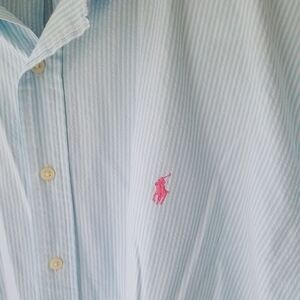 * All orders ship within 1-2 business days * Reasonable offers welcome/Bundle and save! * Smoke free home * Measurements available upon request Classic light blue & white seersucker cotton shirt with button-down design. Features iconic logo. Condition: Gently used / slight discoloration on inside of collar [For seller use only - ]