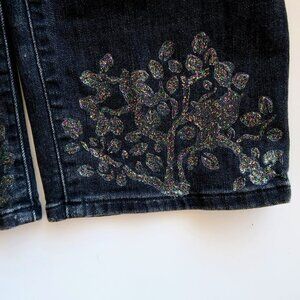 Gorgeous black jeans from Lauren Ralph Lauren. They feature a classic 5-pocket body, belt loops, and sparkly glitter tree application at the hem. I don't know if it was there originally, nonetheless, it adds a unique look. The denim is soft and has stretch to it.