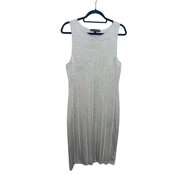 Ralph Lauren Black Label Bateau Mini length Metallic Shift Pullover Dress Size L Silver/Gold, Midi, Sleeveless with Bateau Neckline, Beautiful silver metallic subtly vertical line sleeveless bodycon dress - w/very subtle gold base, Sleeveless, , fully line, there are 2 minor snags in the fabric barely visible, see the last 2 pictures for reference, Other than that it's in excellent pre owned condition.
