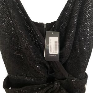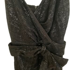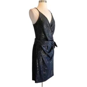 Black velvet with black sequin wrap sheath cocktail dress. Cross over v neck bodice. Attached belt with half bow detail. Hidden back zipper. Fully lined. 91% poly/5% viscose/4% other. Size 2. NWT. This is a stunner! Retail = $245
