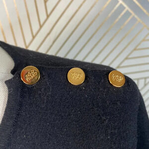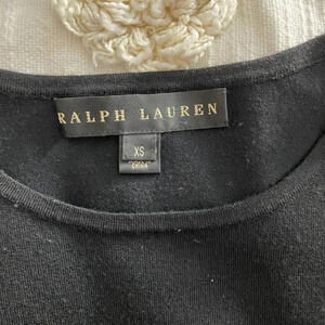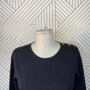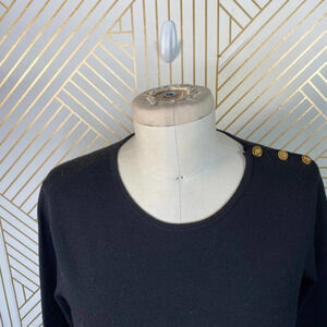 Ralph Lauren Black Label class sweater featuring a rounded crew neckline, shiny gold buttons with RL engraving, long sleeves, and pullover styling.