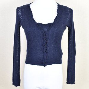 Ruffle trim. Button front v-neck. Long sleeve. Ribbed waist trim. Semi- sheer. Brand tag loose from one side.