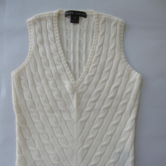 Classic style cashmere sweater vest with cable pattern and v-neck. Cream/off-white color.