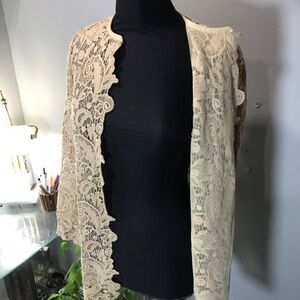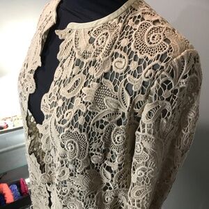 Gorgeous Ralph Lauren Black Label 100% Cotton Crochet open front cardigan, Lamb Leather Trim, Floral pattern, long sleeve mesh cardigan Open front.