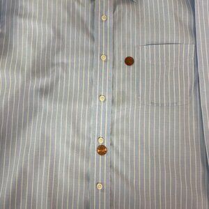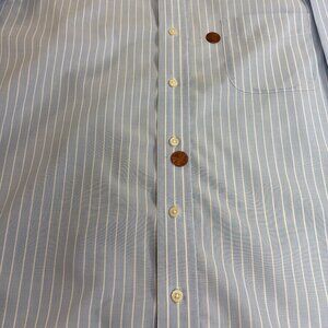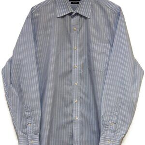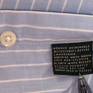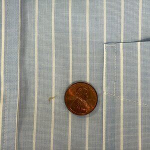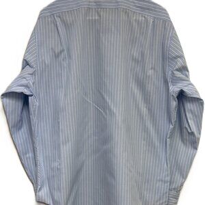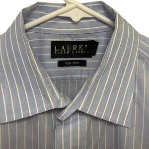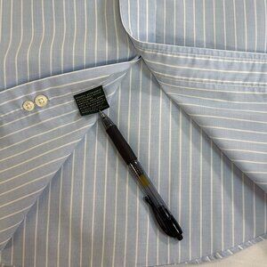 This Beautiful Ralph Lauren Black Label Shirt is a men's regular fit button-up shirt in size 16.5 X 34-35. Made from a 100% cotton material with a NON IRON design. This shirt features a brilliant white Pin Stripe pattern in a Baby Blue color with a collared neckline and long sleeves. Perfect for occasions like travel, workwear, and business, this regular fit shirt is machine washable and suitable for all seasons - winter, summer, fall, and spring. With its premium quality and classic design, this shirt from Lauren Ralph Lauren is a versatile addition to any wardrobe.