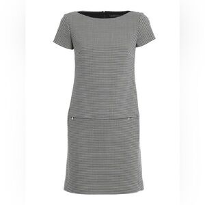 Stretch wool dress styled with hounds-tooth pattern, round neck, short sleeves, zipped pockets, back zip and hook and eye closure and silk lining