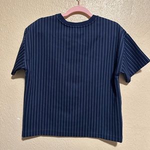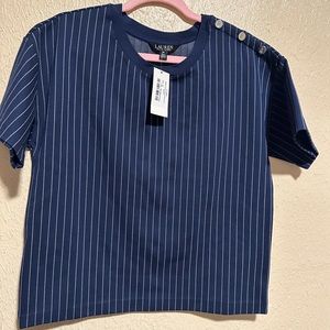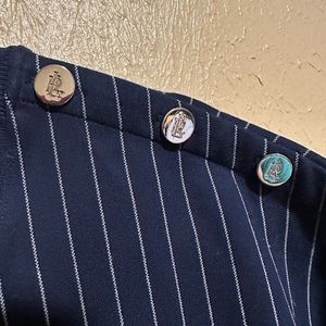 Thick material (feels very well made), short sleeve, button shoulder accents, striped, drape fit, preppy