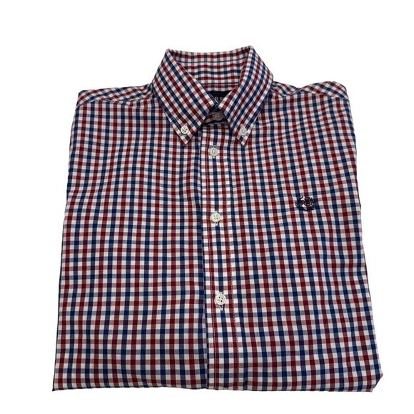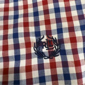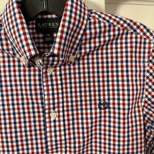 BRAND NEW without tags. Youth boys Ralph Lauren black label button down shirt in red, navy blue & red plaid. Embroidered monogram logo. Size 14. See photos for measurements. MSRP $69