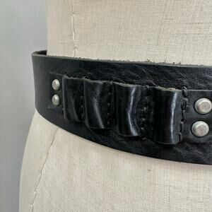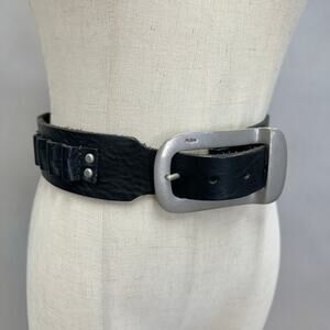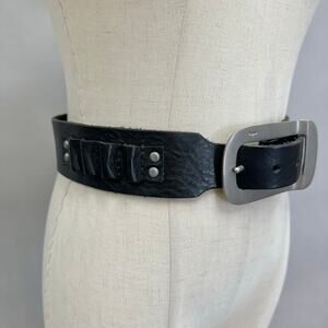 Chunky black leather belt with bold brushed silver buckle. Made in Italy. Size 28. Wide strap + rivet details give it a classic rugged look. Perfect vintage statement piece to elevate any outfit.