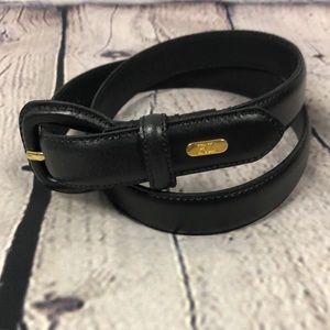 Elegant black leather belt. Features gold accent buckle. Perfect for any outfit. 35” inches.