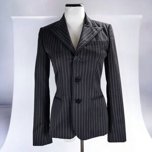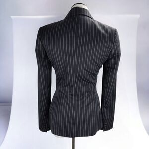 Single breasted - three button blazer with a peak lapel, 4 button cuffs, lined with shoulder pads. Pinstripe print. Woven fabric, does not stretch. Virtually no signs of wear.