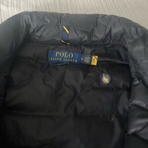 Stylish black puffer jacket with a red logo. Features a sleek design and zippered pockets.