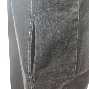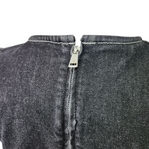 Elegant black denim mini dress featuring stretch denim and pockets. Sleeveless design. Perfect for day or night.