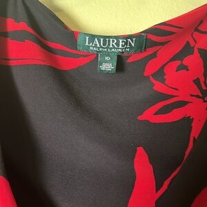 This stunning Ralph Lauren dress combines a bold black and red color palette with a sophisticated sheath silhouette. Featuring a v-neckline and 3/4 sleeves, it's perfect for a cocktail night out. The wrap-style design adds an elegant touch, while the soft, stretchy fabric ensures a comfortable fit.