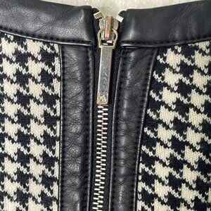 Houndstooth pattern with Long Sleeves in knit sheath dress with vegan faux leather trim, scoop neck and front pockets.