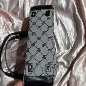 Ralph Lauren women’s grey black trim small handbag purse. Brand new with no tags. Elegant tote with Ralph Lauren monogram. Black handles and white patterned fabric.