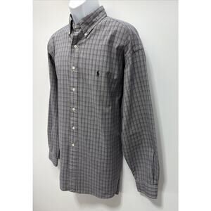 This Ralph Lauren Blake Men's XXL shirt features a small plaid print, button-down style, long sleeves, collared neckline, and is made of lightweight cotton fabric. Suitable for travel, casual wear, and business occasions, this shirt is easy to care for with machine washable instructions. The gray color and woven fabric make it a versatile and stylish addition to any man's wardrobe, perfect for all seasons including winter, fall, and spring.