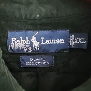 The Ralph Lauren Blake Shirt in size XXL is a classic and preppy green corduroy button-down with long sleeves and a collared neckline. Made of 100% cotton, this vintage shirt is perfect for casual occasions and all seasons. Featuring an embroidered pony logo, this easy-care shirt by Ralph Lauren offers a regular fit and is machine washable for added convenience.