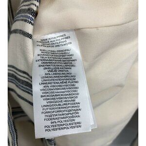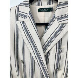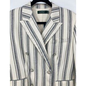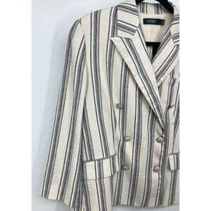 A women's double breasted button jacket blazer from Ralph Lauren. The jacket is ivory, black, and blue with a striped pattern with a linen fabric. The jacket is lined, shoulder pads, pockets, and the jacket is new with tags.