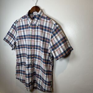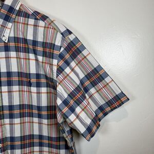Ralph Lauren Bleeding Madras Bue White Green Yellow Short Sleeve Plaid Shirt Size Large ~button down collar ~short sleeve Approximate measurements are flat lay measurements: ~armpit to armpit 22.5" ~length 29" 100% Cotton Machine wash/dry In excellent preowned condition with no rips, tears, holes or stains noted! Tags: plaid natural classic preppy summer spring 4/4/25