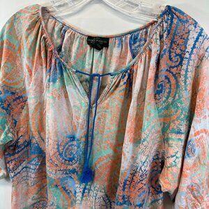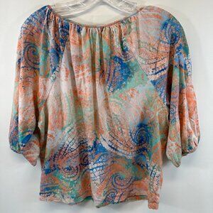Such a beautiful blouse for the summer months. Colors are vibrant and pretty; looks great with jeans or white pants or shorts.