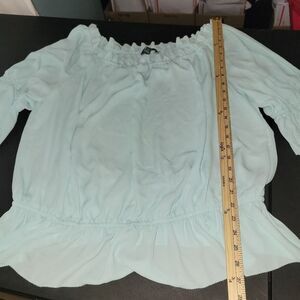 Item: women's lightweight blouson top with flared sleeves and flowy hemline, ruffle detail around neckline, can be worn offshoulder, plus size 2X