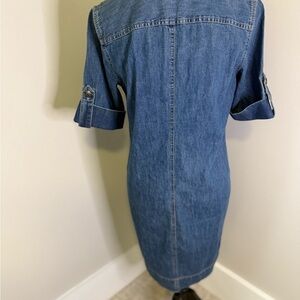 Chic denim shirt dress with short sleeves. Ideal for casual wear.