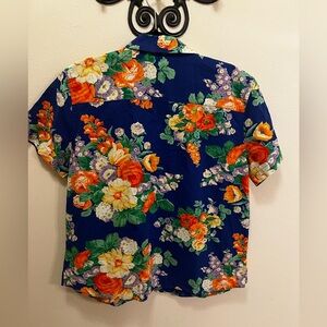 Vintage vibrant floral design. Short sleeves. Classic button-down style. Perfect for casual wear.