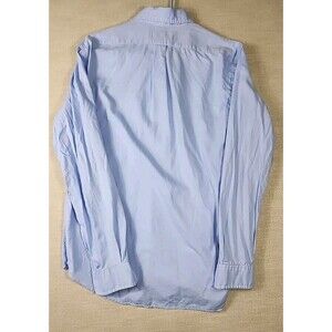 This Ralph Lauren Blue Label men's shirt is a classic denim button-down dress shirt in a solid blue color. Made from 100% cotton, it features a collared neckline, long sleeves, and a slim fit in size Large. The shirt has a button closure and a logo accent, with a fabric wash that gives it a light finish suitable for all seasons. This versatile piece can be worn for various occasions such as parties, casual outings, or business settings, offering a timeless and basic style with a touch of sophistication.