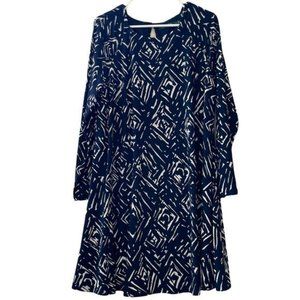 Stylish blue dress with white geometric patterns. Long sleeves. Perfect for any occasion.