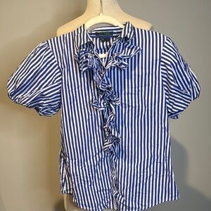Stylish blouse with blue and white stripes. Features ruffled front detail. Short puff sleeves.