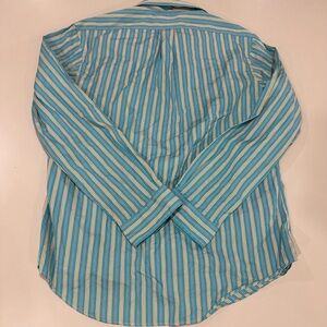 This Ralph Lauren shirt features a classic blue and white striped pattern, perfect for a smart-casual look. Crafted from quality materials, it offers comfort and style for any casual occasion. The crisp design and tailored fit make it a versatile addition to your wardrobe. EUC