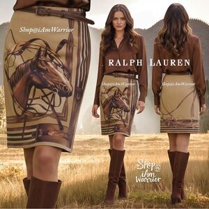 Ralph Lauren blue label collection NWT (high end) stunning genuine suede equestrian horse print wrap skirt with leather belt. New with tags, extremely RARE, retailed at $1,298. Size 10. Please see all photos for measurements PRIOR to purchase! Pair this with a turtleneck &/or blazer & tall boots for a high end look. Amazing detail, truly a work of art! This will be a coveted piece you will cherish for years to come!