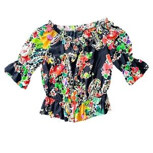 Ralph Lauren Boho On Off Shoulder Top Peplum Black Floral Vibrant Preppy Small