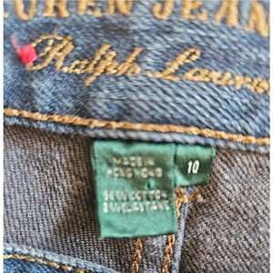 Ralph Lauren Bootcut Jeans in Dark Wash. Size 10. Features high-rise, zip fly with button closure, 5-pocket design, belt loops, logo patch at back, and bootcut leg. Excellent pre-owned condition, no flaws.