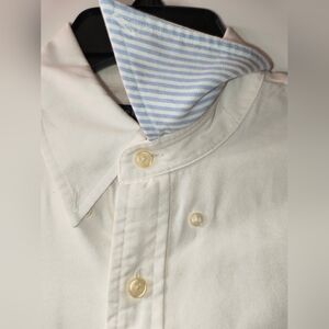 Classic Ralph Lauren boy’s button-down oxford shirt in size 10. Made of crisp 100% cotton with the iconic embroidered Polo logo on the left chest — brown horse, rider in white pants, blue shirt, and red hat.