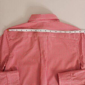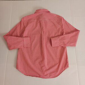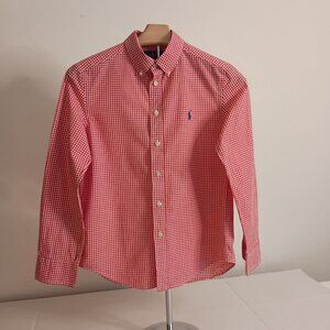 Classic red and white gingham button-up shirt by Ralph Lauren. Features long sleeves, button cuffs, and a timeless preppy style. Perfect for holidays, family photos, school, or everyday wear. In excellent preowned condition.