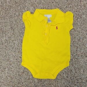 Vibrant yellow bodysuit from Ralph Lauren with polo collar. Features iconic logo on chest. Short sleeves with ruffle detail. sz 6 months. 100% cotton