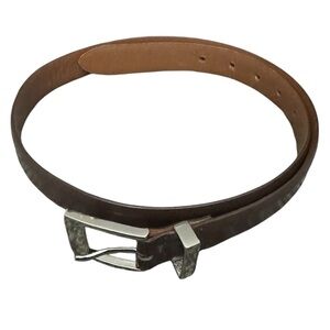 Stylish brown leather belt with a sleek silver buckle. Perfect for any occasion. Solid brass buckle. Some normal wear to leather.