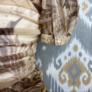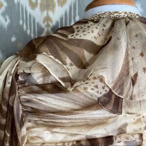 Elegant and romantic brown & cream-toned leaf pattern silk-crepe blouse.