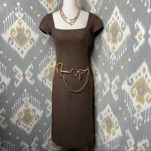 Ralph Lauren Brown Herringbone Lambswool Tweed Cap Sleeve Sheath Midi Dress