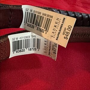 Elegant woven leather belt by Ralph Lauren. Features a dark brown hue with a classic buckle design, size medium approx 41” long and 1/2” wide. Medium brown leather belt by Ralph Lauren, gold studded with a classic buckle design, size medium approx 38” long and 1/2” wide. This listing is for both belts. Gently used in good condition, original owner, purchased from fine retail store, closet kept.