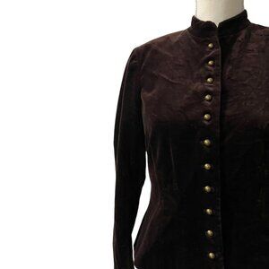 Channel timeless sophistication in this Ralph Lauren velvet jacket with vintage military flair. Crafted from deep chocolate brown velvet, this structured piece features a fitted silhouette, mandarin collar, and a dramatic row of antiqued brass dome buttons. Inspired by classic riding jackets and 19th-century tailoring, this piece adds polish and power to any look.