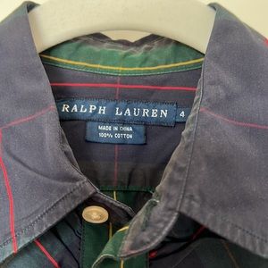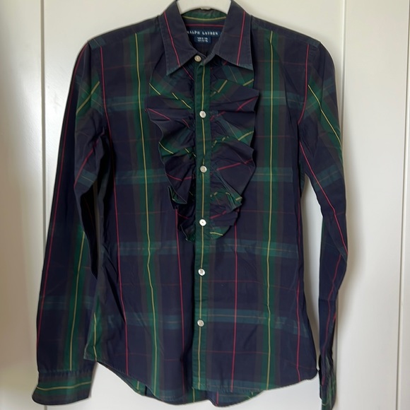 Cute, preppy Ralph Lauren button-down with ruffle. EUC. Slim fit.