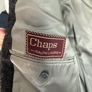 This vintage Ralph Lauren CHAPS sport coat in size 46 features a classic black and gray tweed fabric with a green check pattern, making it a stylish and versatile addition to any man's wardrobe. The regular fit, three-button sleeve, and single-breasted front give it a timeless and sophisticated look, perfect for a sporty yet polished appearance. Crafted from wool with a polyester lining, this jacket is designed for dry clean only to maintain its quality and appearance. Ideal for those who appreciate classic style and attention to detail in their outerwear.