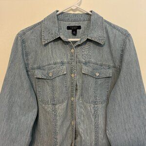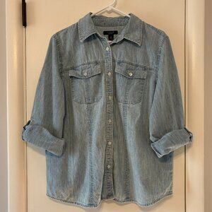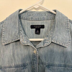 A classic blue chambray button-front shirt/top/blouse from Ralph Lauren's Chaps line that is in EXCELLENT condition - please see photos! Size is a women's Plus 1X. Material is 100% cotton. Tab sleeves can be worn long or rolled up and buttoned to shorter length - please see first two photos.