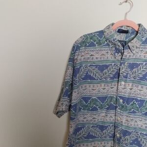 Ralph Lauren Chaps Cotton Short Sleeve Hawaiian Button down Shirt with blue, green, orange and white tropical leaf and geometric print and chest pocket with button closure