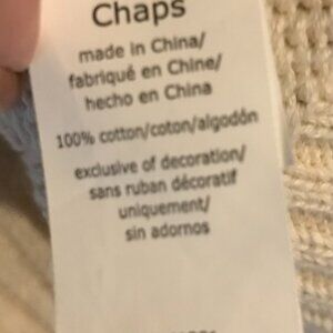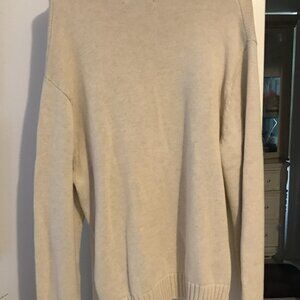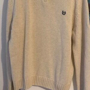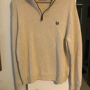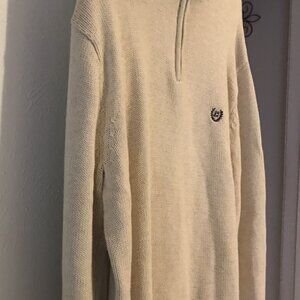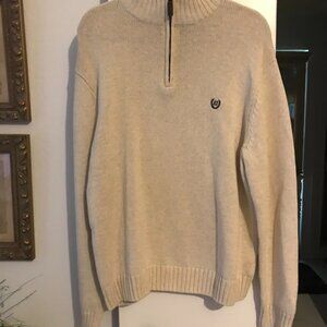 Ralph Lauren Chaps L/G men's half zip sweater, tan/cream colored, 100% cotton. Thick and warm but comfortable to wear. New condition. Leather covered zipper pull. Chaps logo embroidered on left chest. Can be worn open zip or closed. Nice ribbing at collar, bottom of sleeves and bottom of sweater. 28 1/2 inches long shoulder to bottom, 25 inches across chest, 26 1/2 inch long sleeves. Male or female could easily wear.