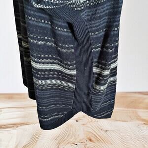 Please zoom photos since there is an interesting solid navy ribbed knit accent down each side incorporated in the side slits as well as the same stripe on the shoulders and on the outer side of the Sleeves.