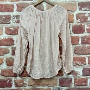 ▪️ Women’s Top: Scoop neckline, button front closure, embroidered striped relaxed look pattern, semi-sheer, and long sleeves. Pre-owned. Wear it with your favorite pants!